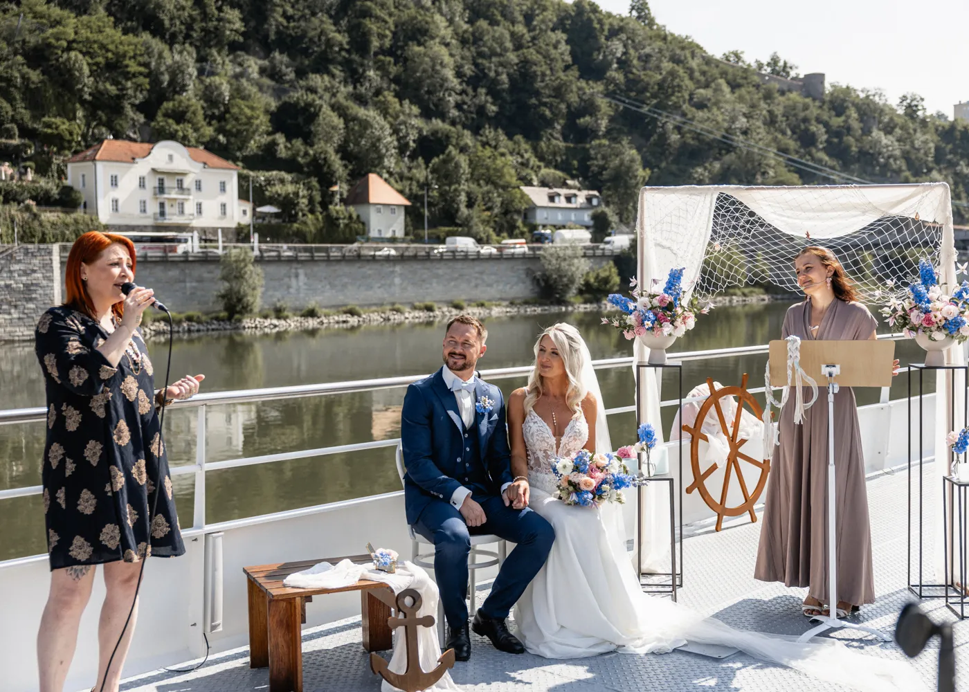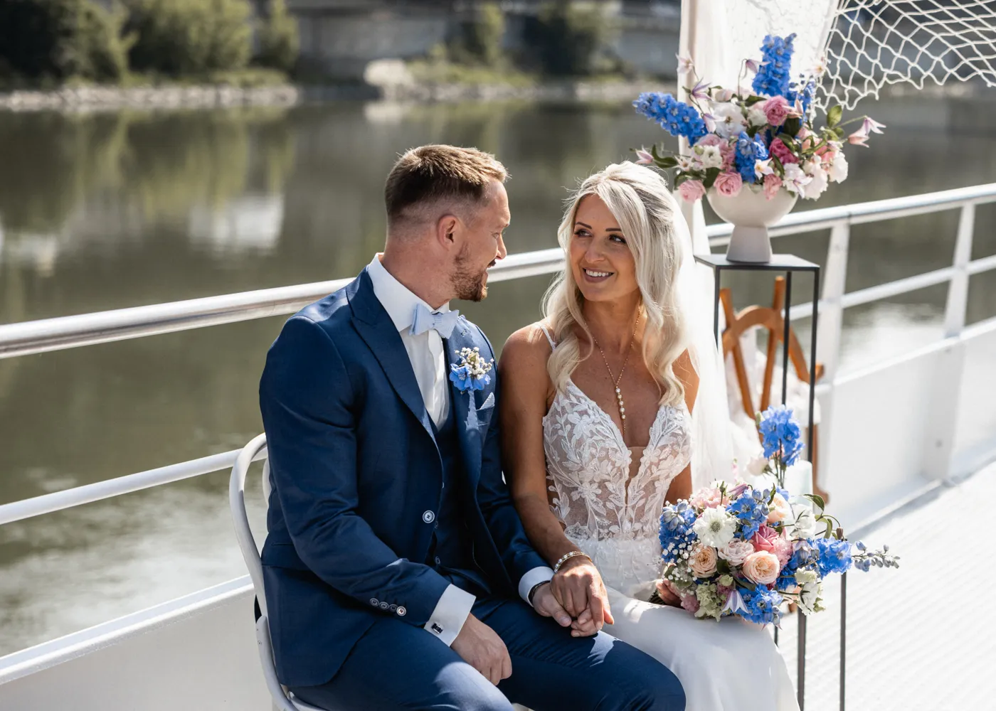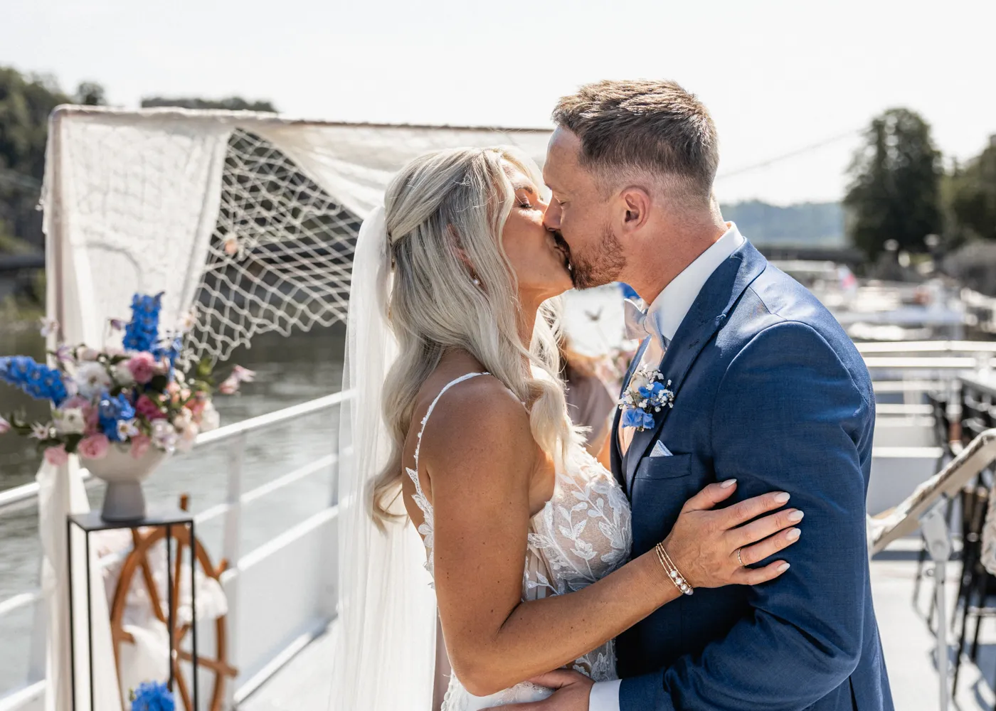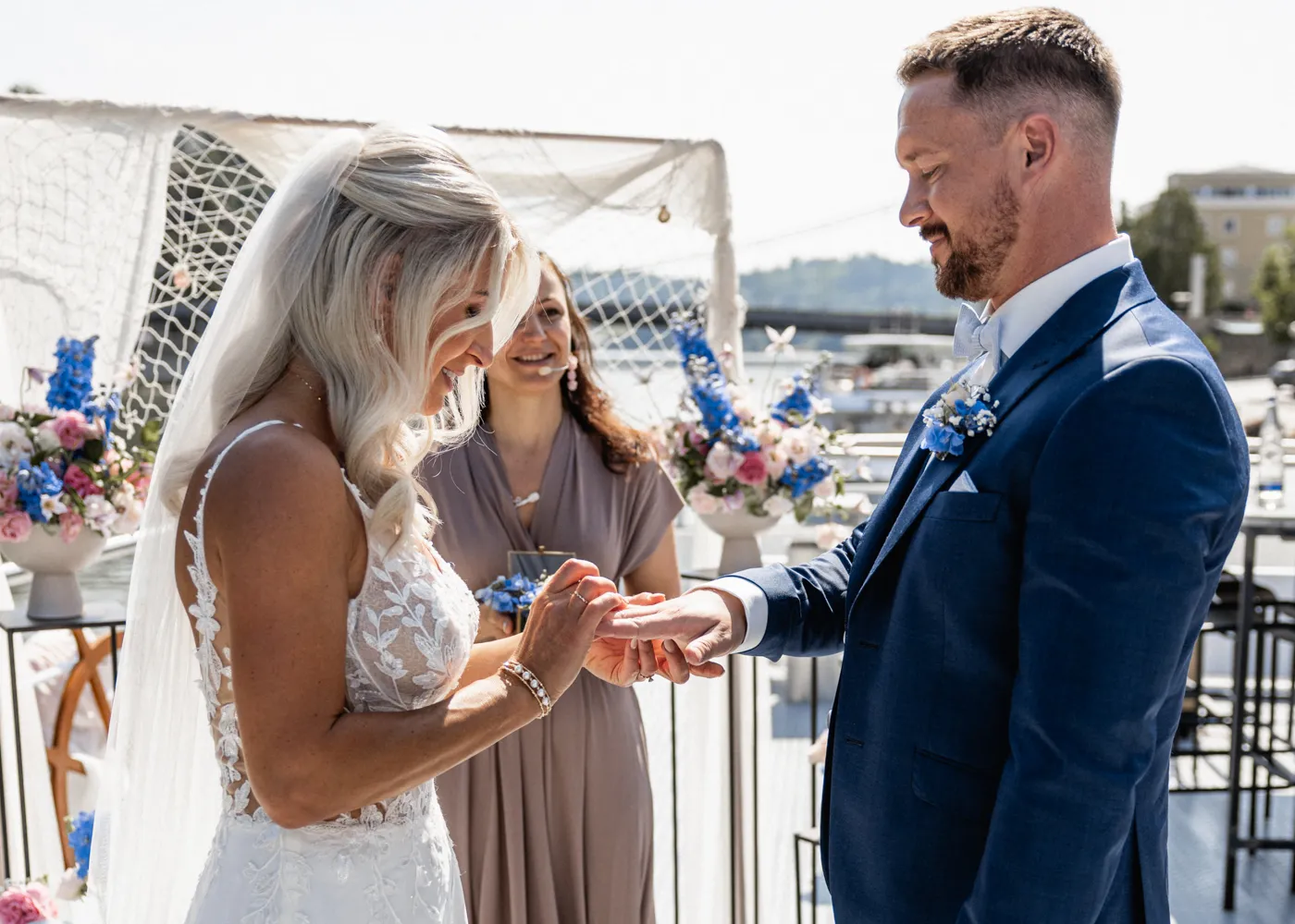 freien Trauung auf dem Barefoot Boat, einem modernen Schiff mit warmem, einladendem Charme. Umgeben vom Wasser der drei Flüsse, goldenem Licht und ihren Liebsten entstand eine Atmosphäre, die leicht, frei und unglaublich herzlich war.