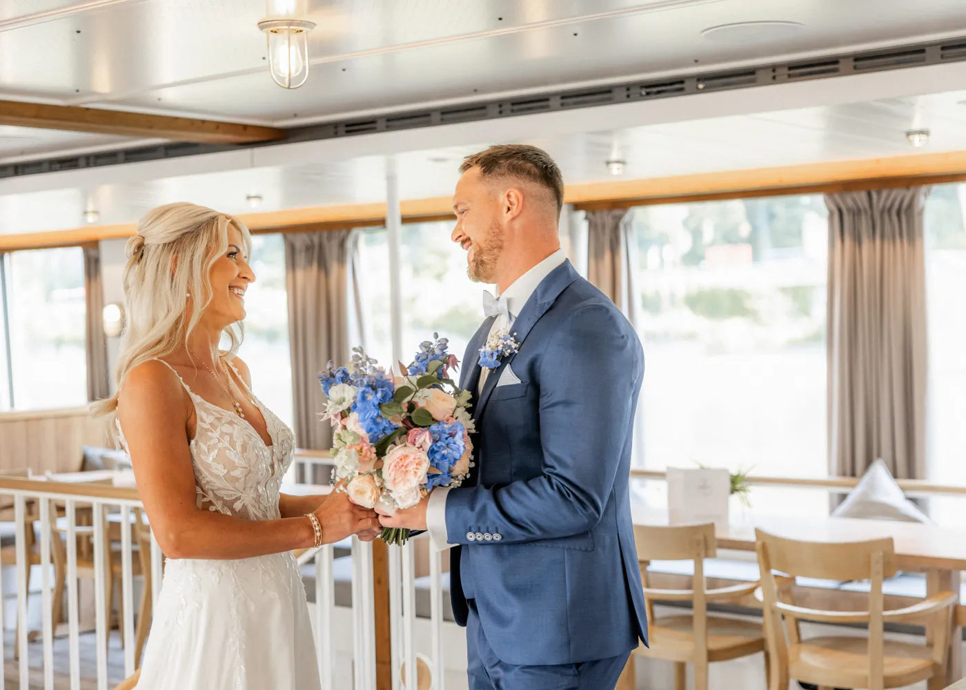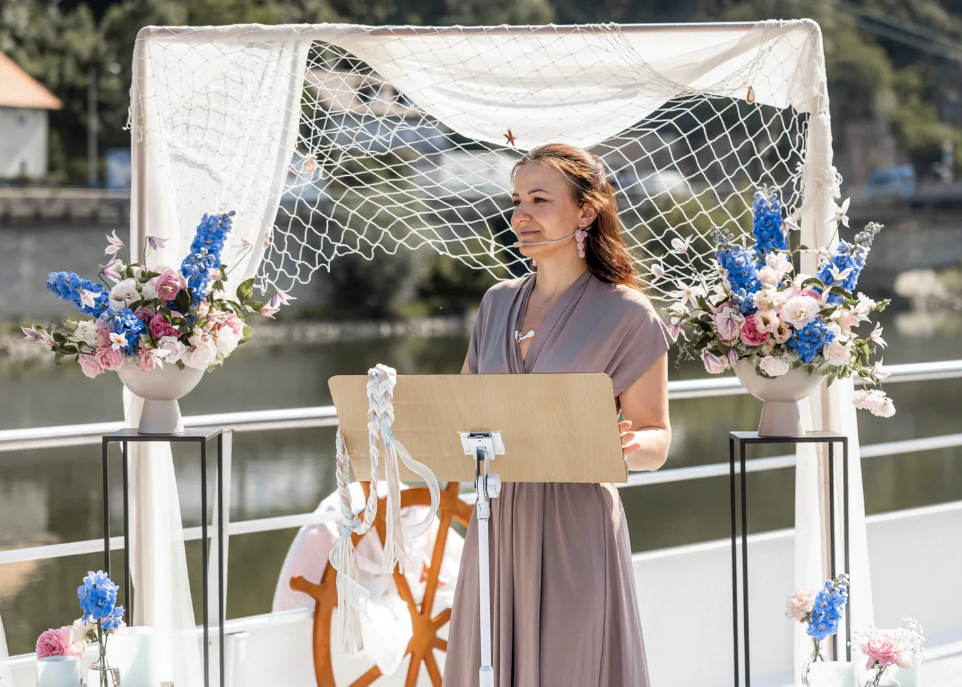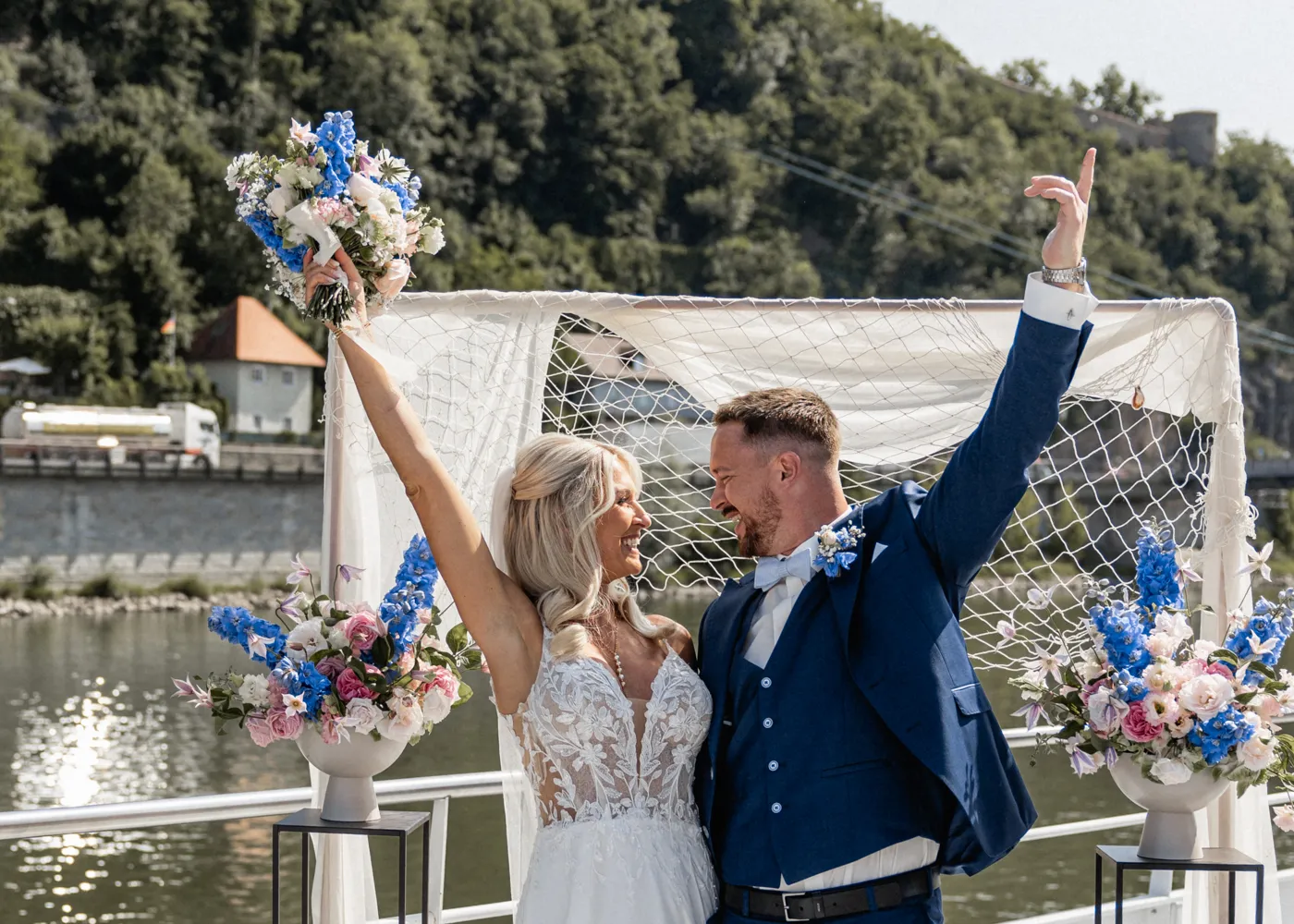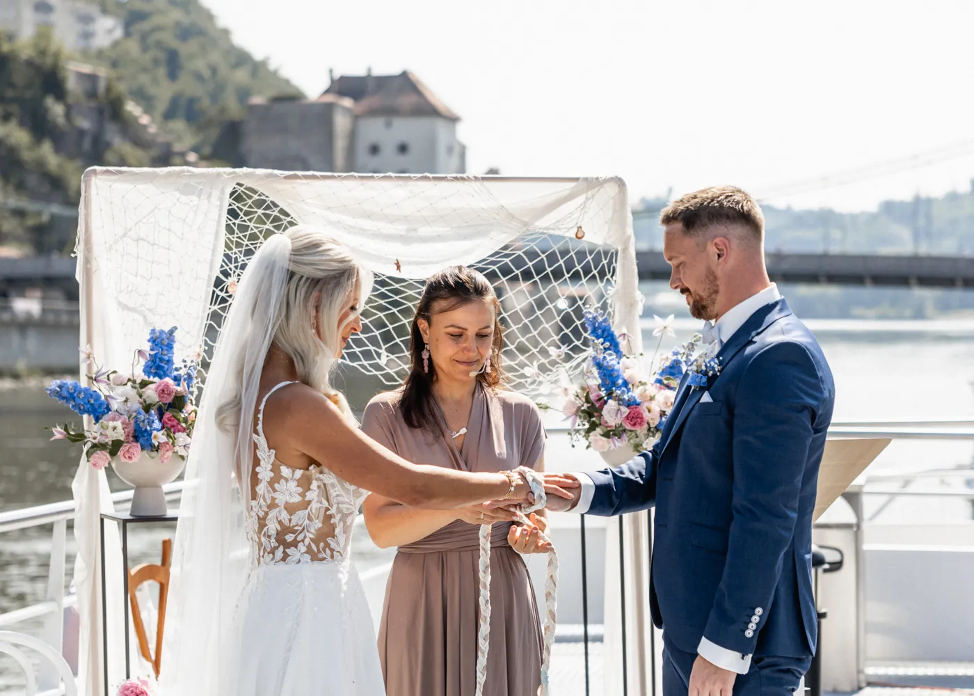 freien Trauung auf dem Barefoot Boat, einem modernen Schiff mit warmem, einladendem Charme. Umgeben vom Wasser der drei Flüsse, goldenem Licht und ihren Liebsten entstand eine Atmosphäre, die leicht, frei und unglaublich herzlich war.