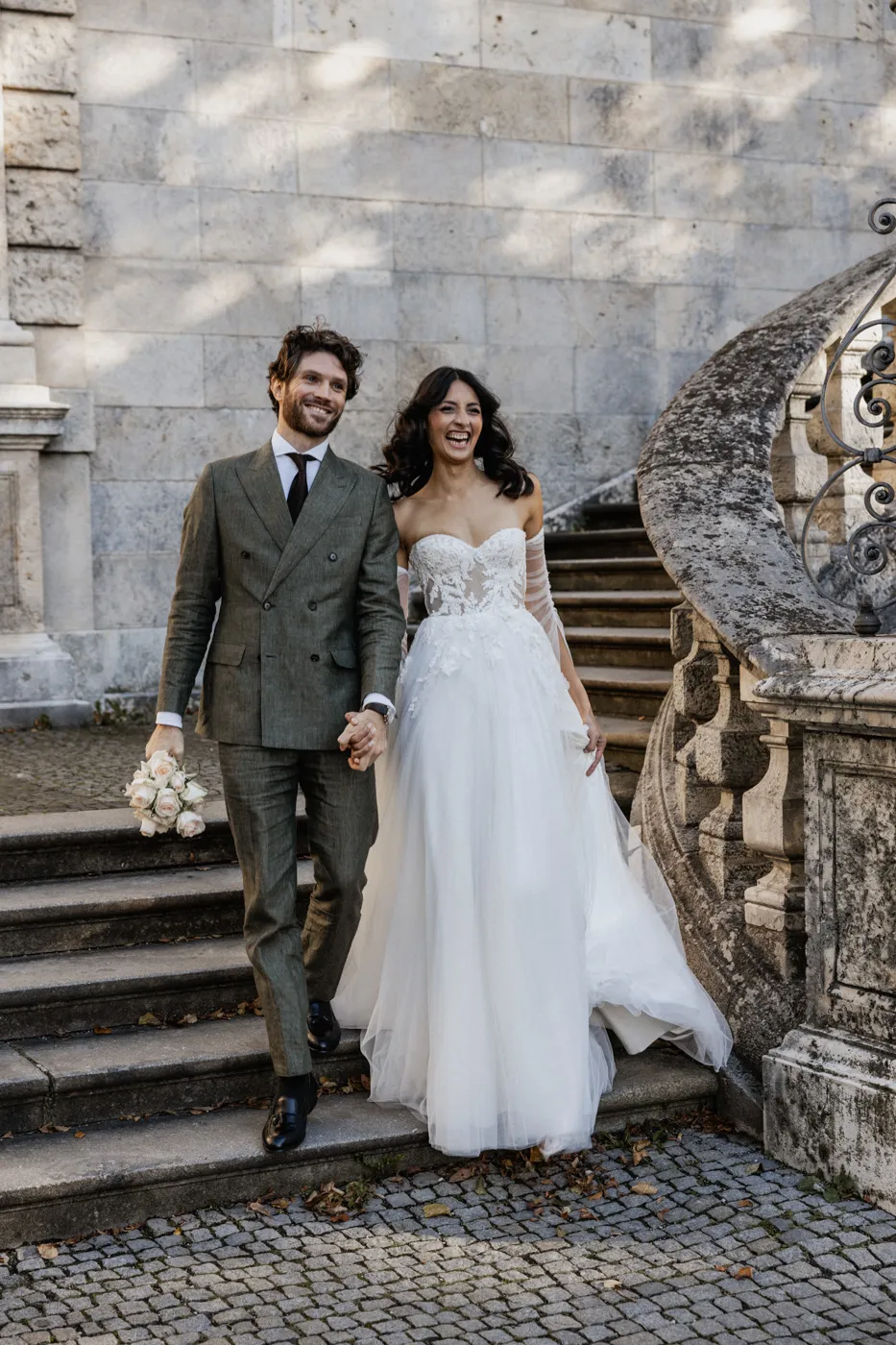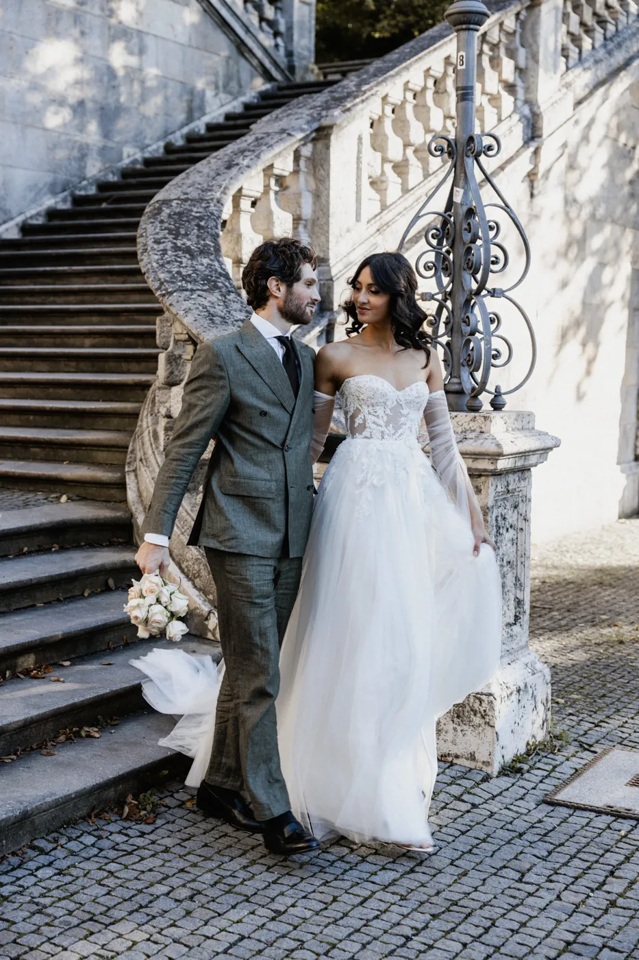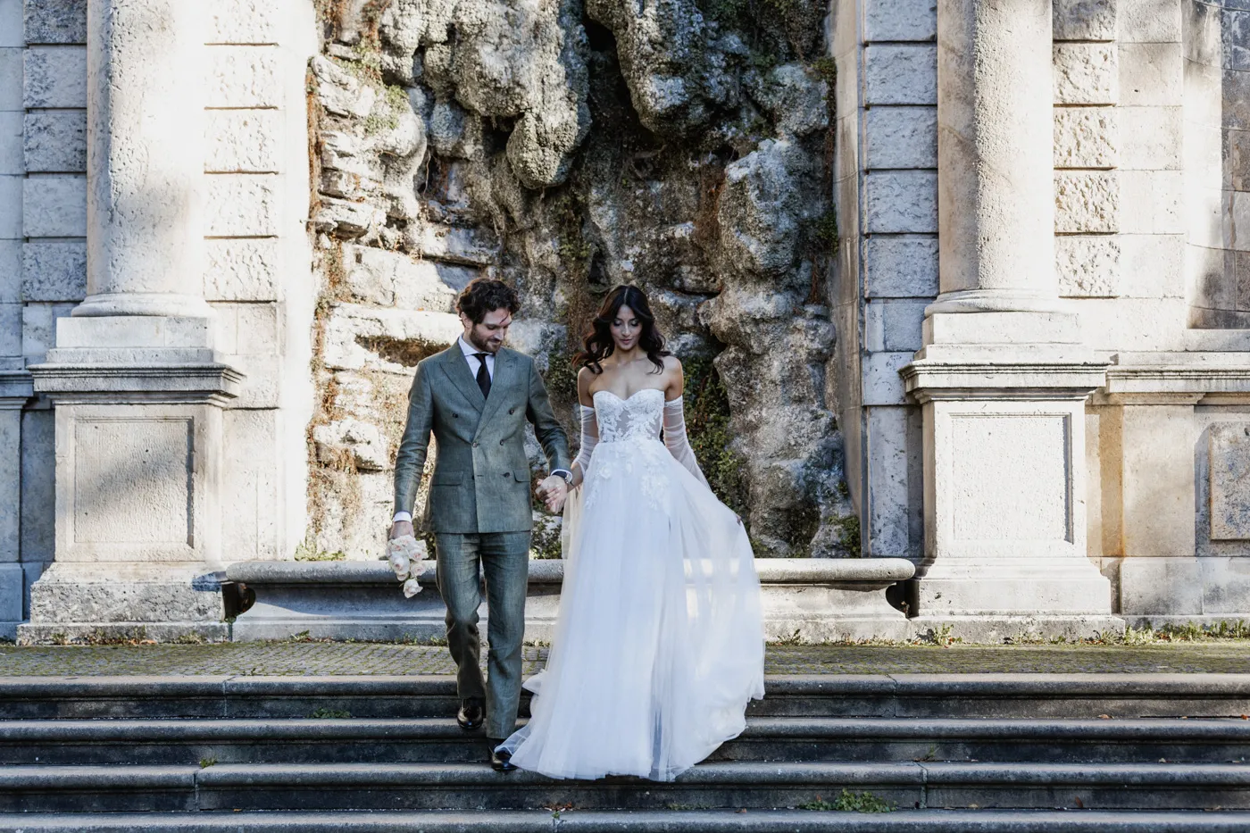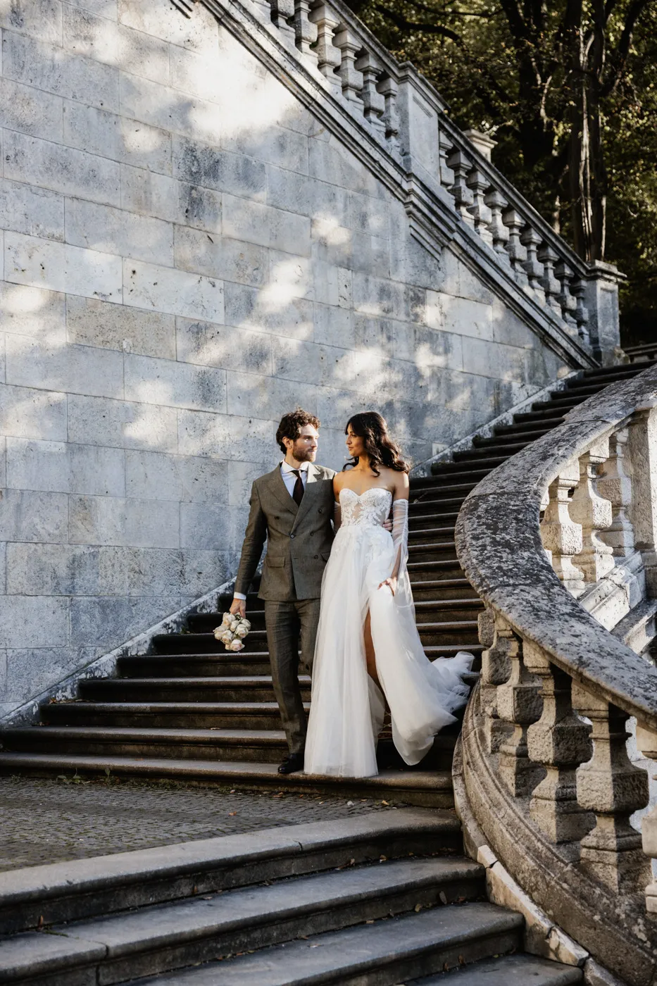 Für das Paarshooting ging es anschließend zum Friedensengel. Die imposante Treppe, der Blick über die Stadt und das goldene Licht gehören zu Münchens schönsten Fotospots, und genau dort entstanden natürliche, elegante und urbane Paarfotos mit tiefen Emotionen, verliebten Blicken und modernen Details.