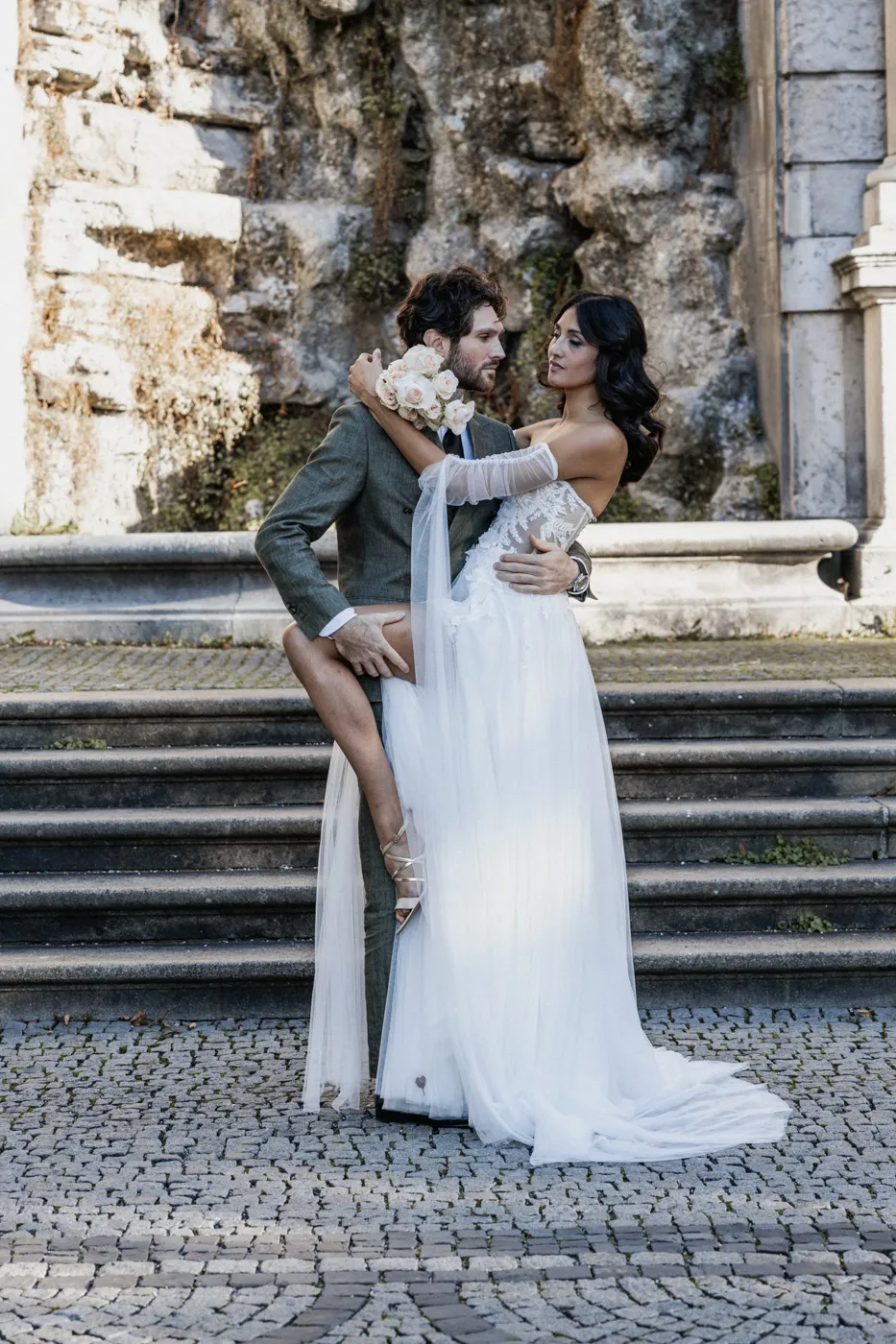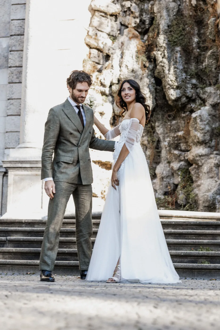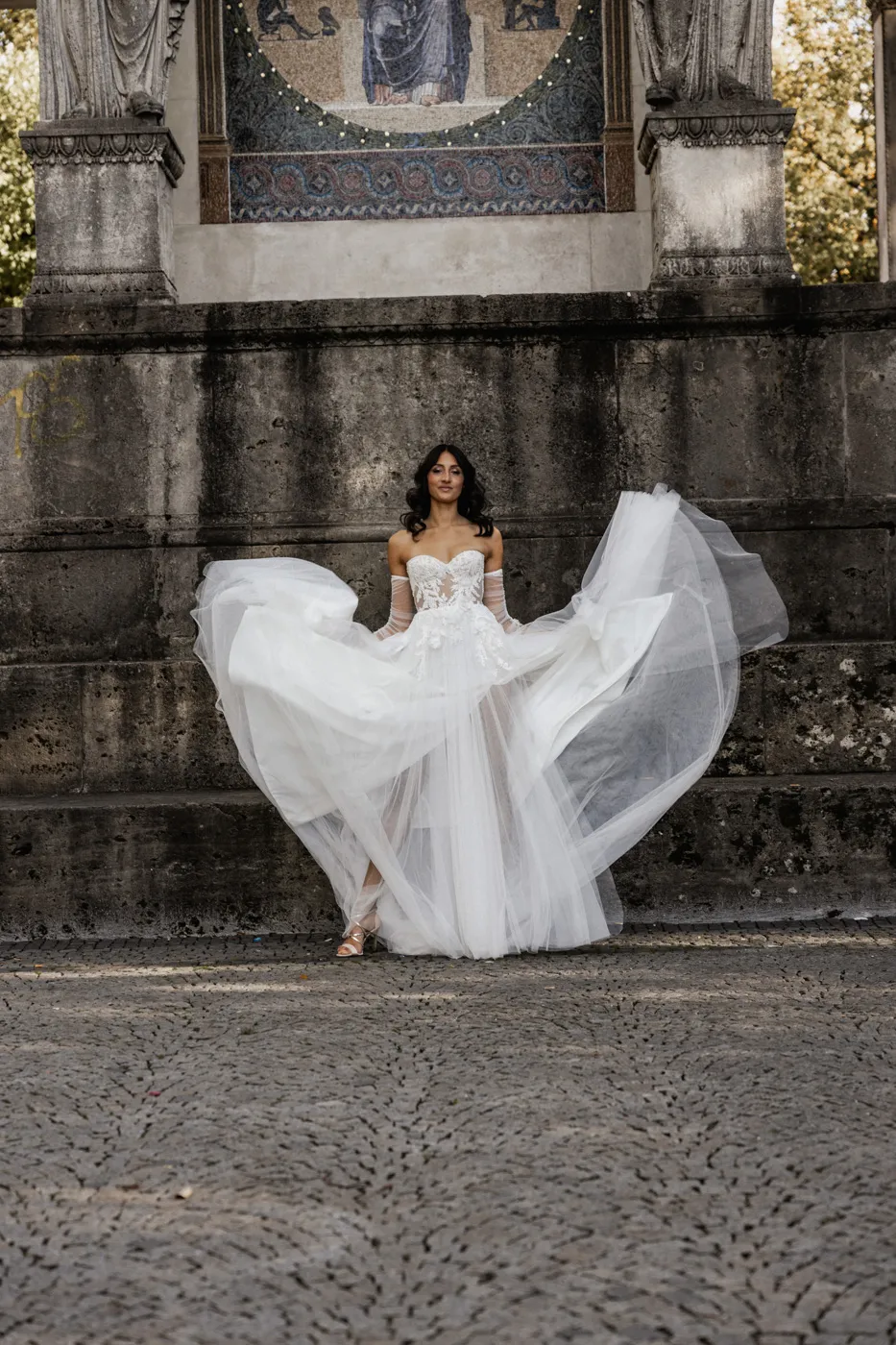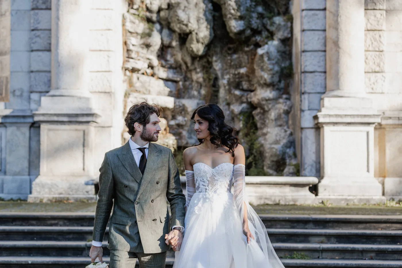 Für das Paarshooting ging es anschließend zum Friedensengel. Die imposante Treppe, der Blick über die Stadt und das goldene Licht gehören zu Münchens schönsten Fotospots, und genau dort entstanden natürliche, elegante und urbane Paarfotos mit tiefen Emotionen, verliebten Blicken und modernen Details.