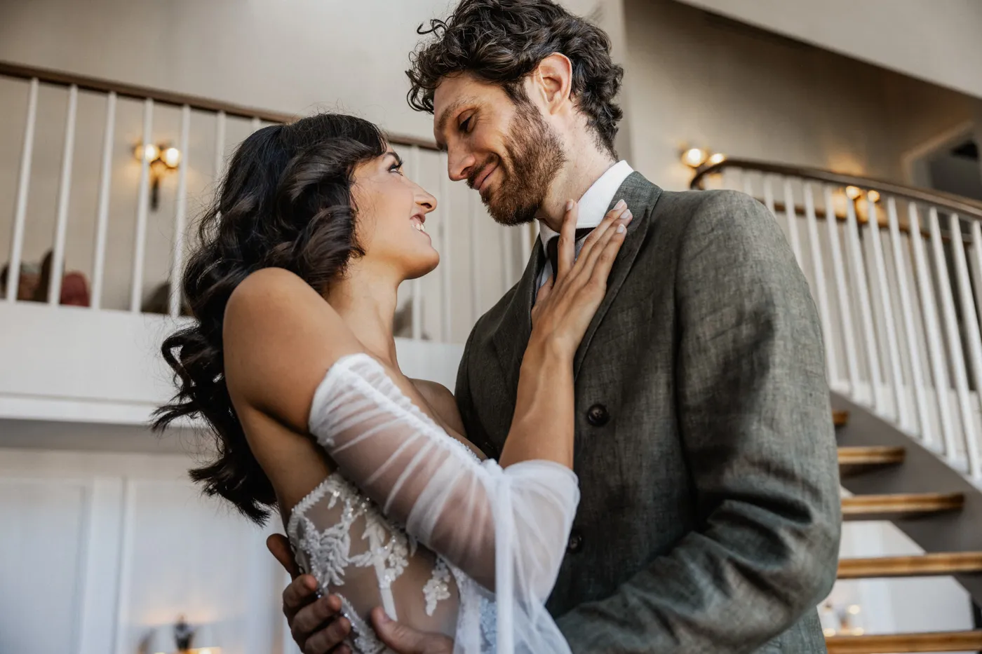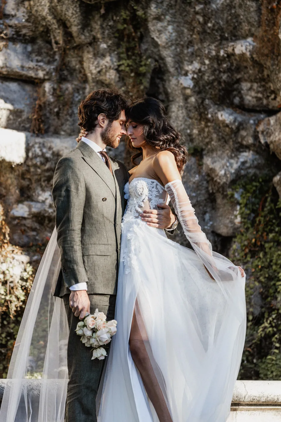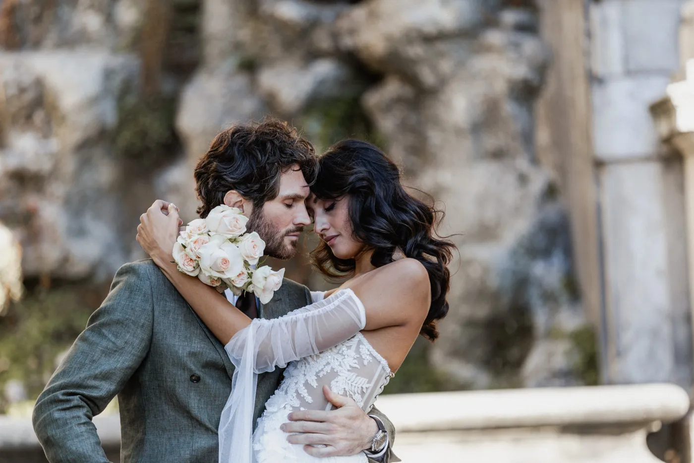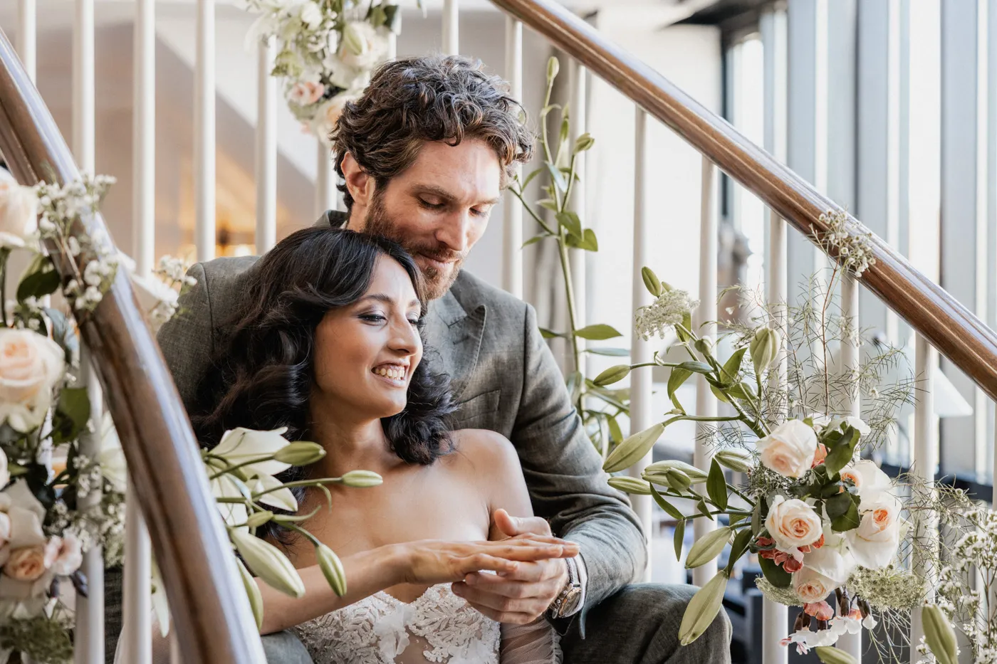 Für das Paarshooting ging es anschließend zum Friedensengel. Die imposante Treppe, der Blick über die Stadt und das goldene Licht gehören zu Münchens schönsten Fotospots, und genau dort entstanden natürliche, elegante und urbane Paarfotos mit tiefen Emotionen, verliebten Blicken und modernen Details.