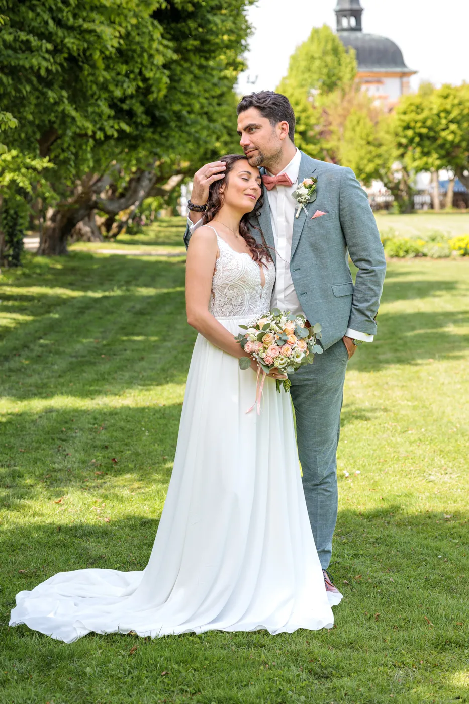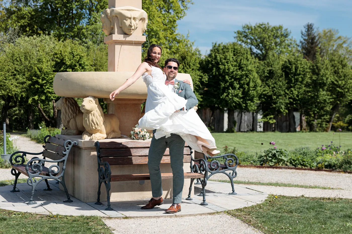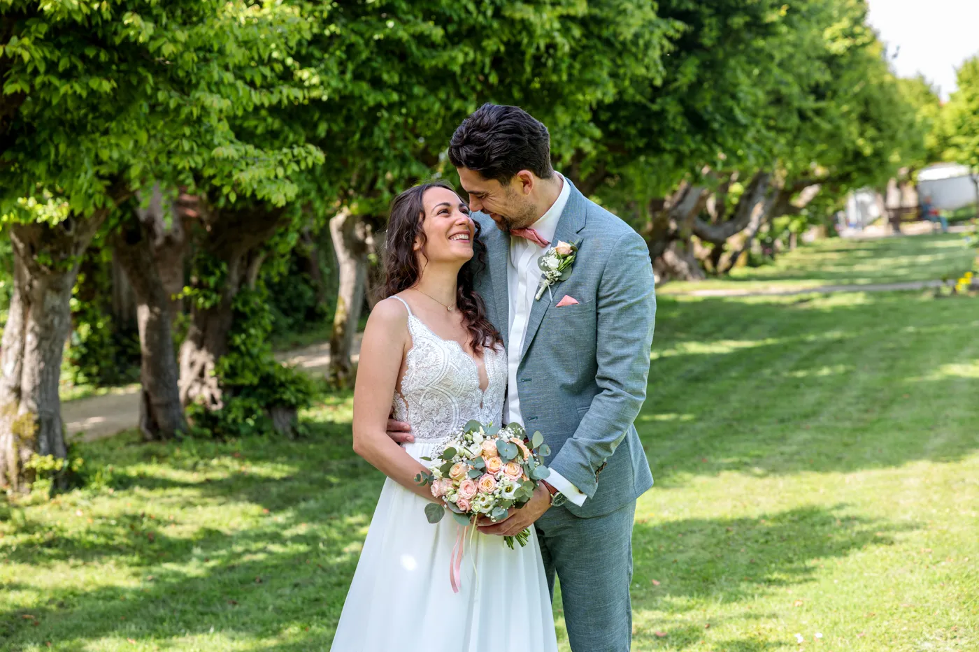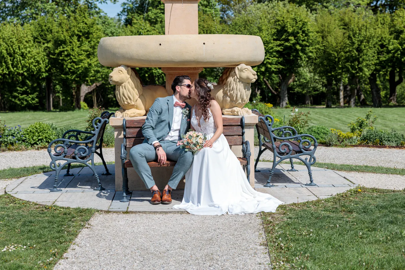 Nach der Trauung ging es für uns in den Herrengarten, einen gepflegten Barockgarten, der mit seinen Alleen, Blumenbeeten und dem sanften Licht einfach perfekt für natürliche Paaraufnahmen ist. Genau hier entstehen die Fotos, die man sich ein Leben lang ansieht: entspannt, vertraut, voller Gefühl.