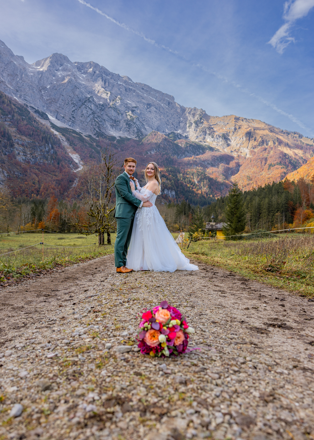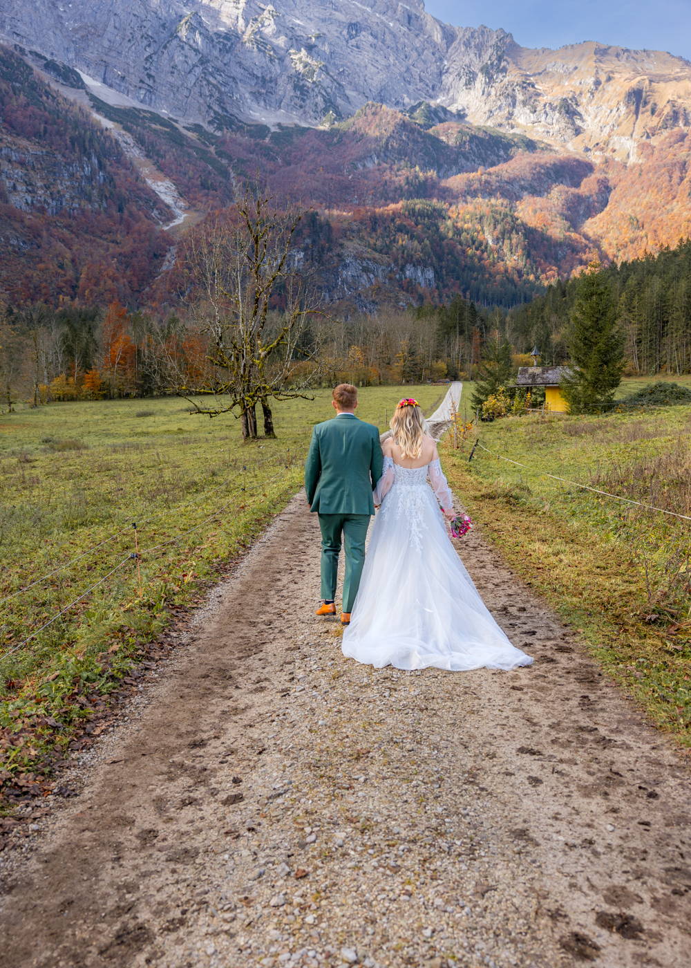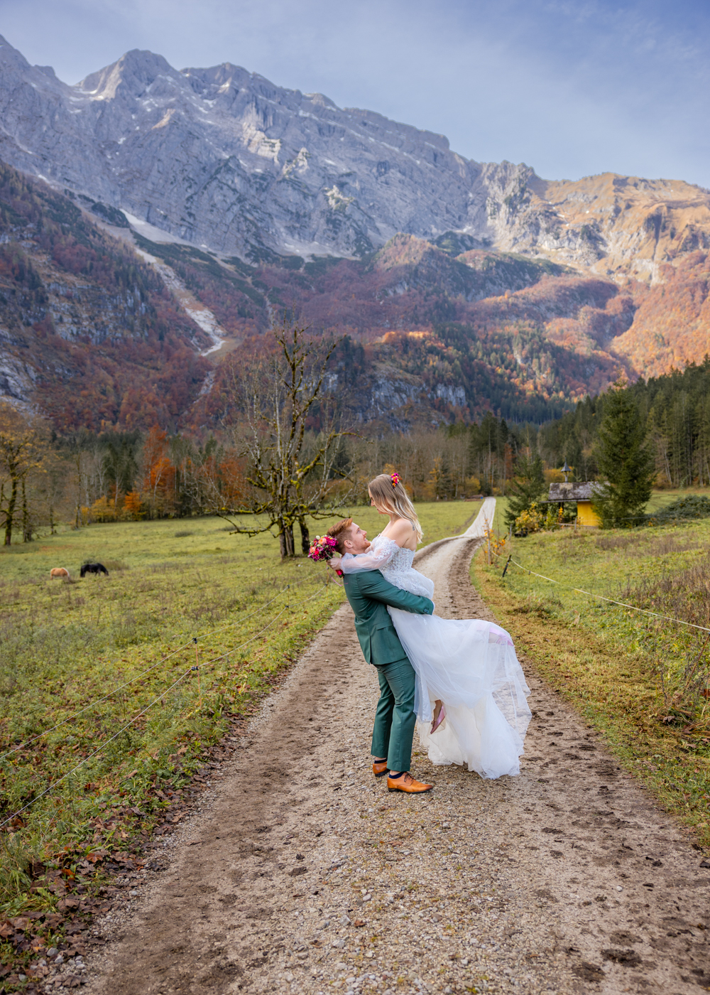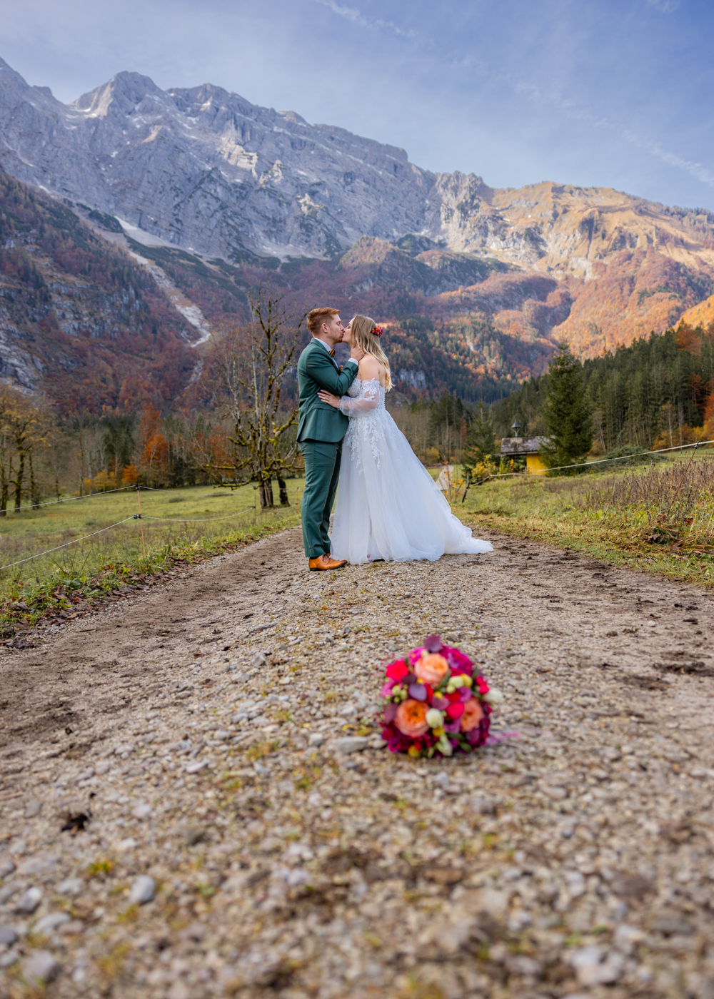 Der Kühschwalbweg liegt versteckt im Salzburger Land, direkt unterhalb des Hohen Göll. Ein Platz, der schon von den Kelten verehrt wurde – ruhig, mystisch und weit weg vom Trubel klassischer Hochzeitslocations. Perfekt für Paare, die Natürlichkeit, echte Momente und pure Emotionen suchen.