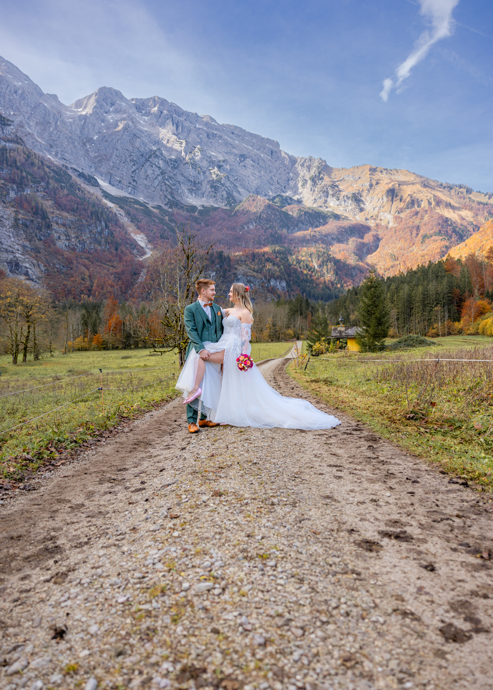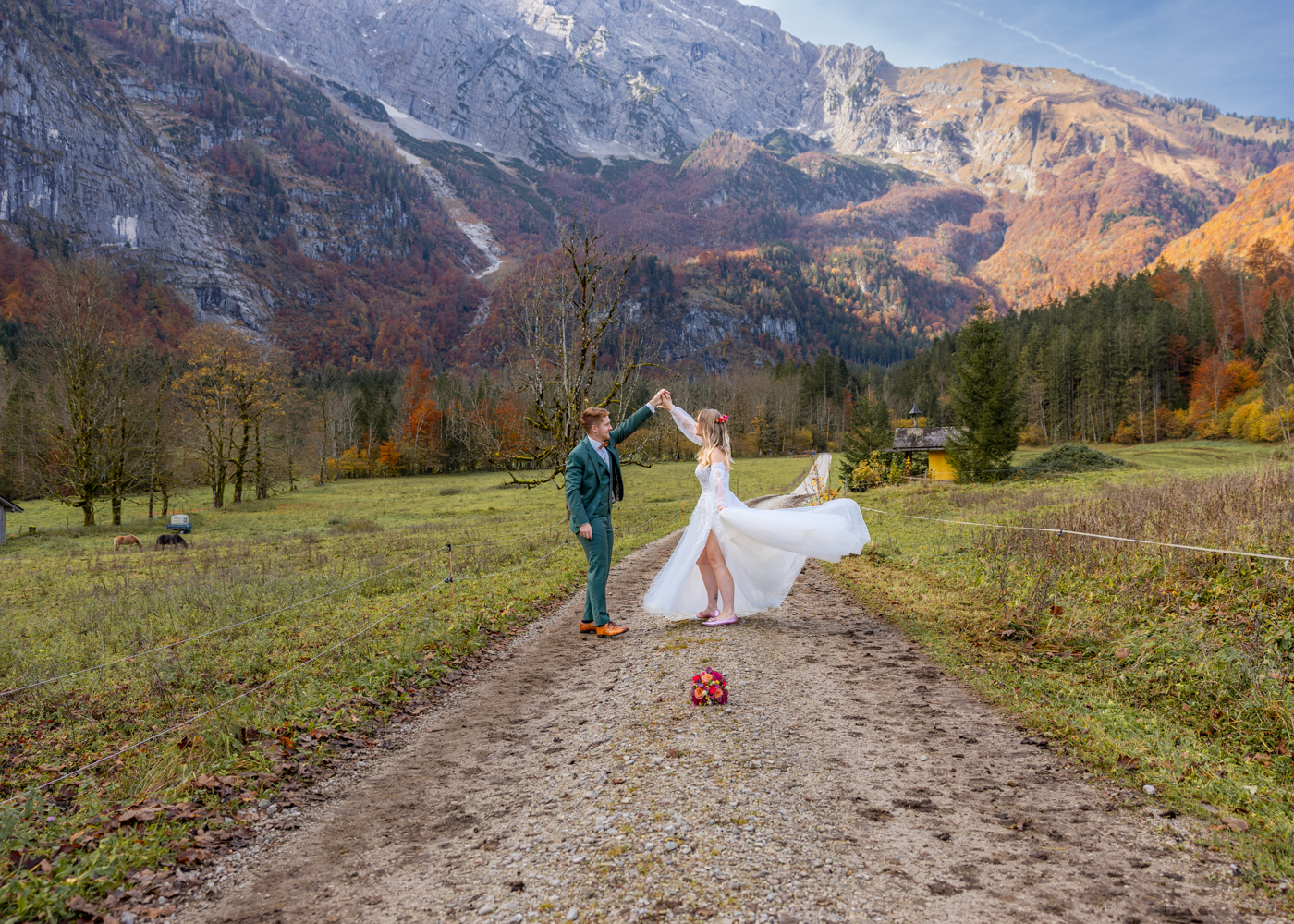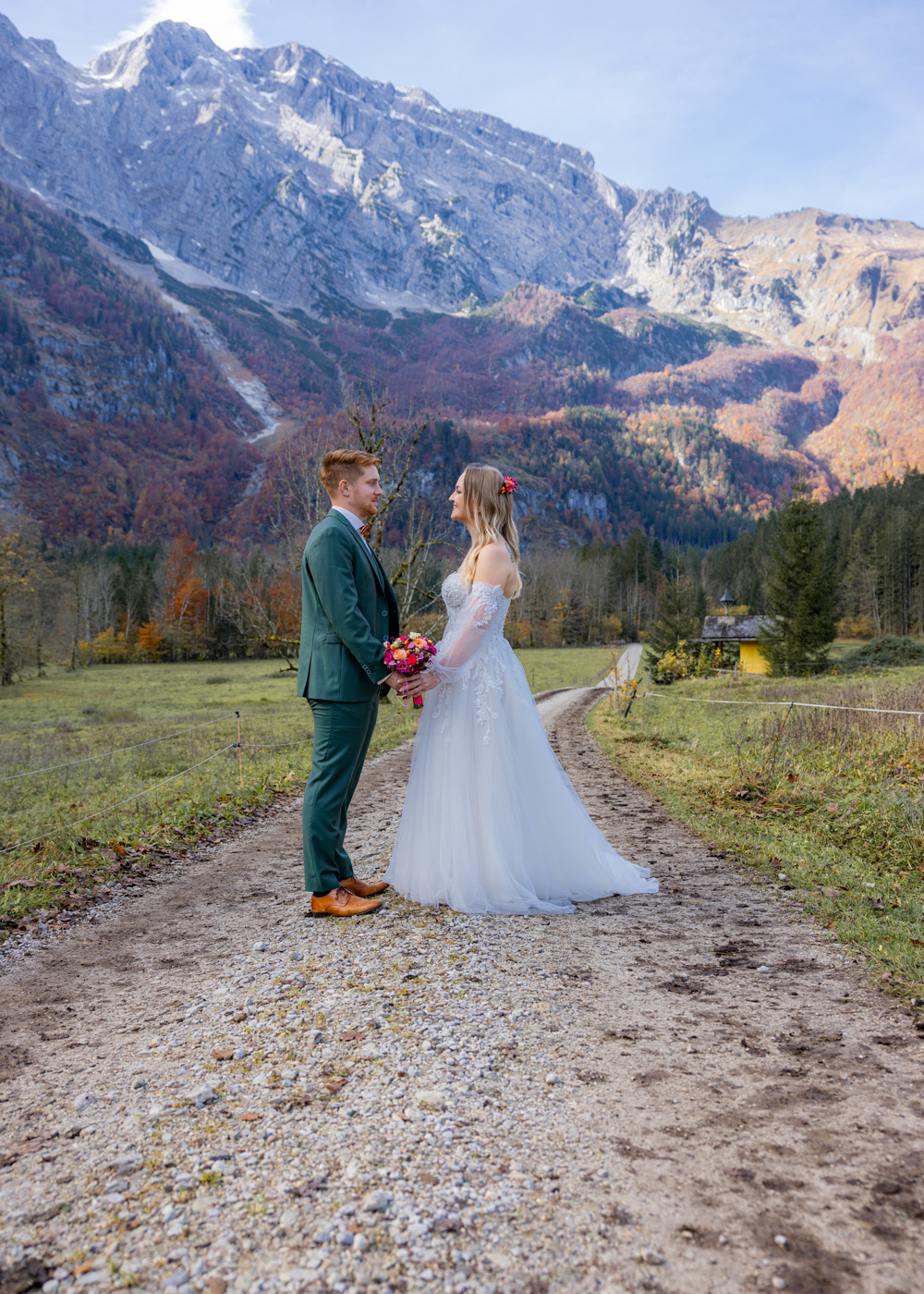 Der Kühschwalbweg liegt versteckt im Salzburger Land, direkt unterhalb des Hohen Göll. Ein Platz, der schon von den Kelten verehrt wurde – ruhig, mystisch und weit weg vom Trubel klassischer Hochzeitslocations. Perfekt für Paare, die Natürlichkeit, echte Momente und pure Emotionen suchen.
