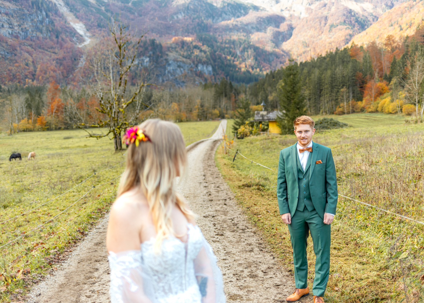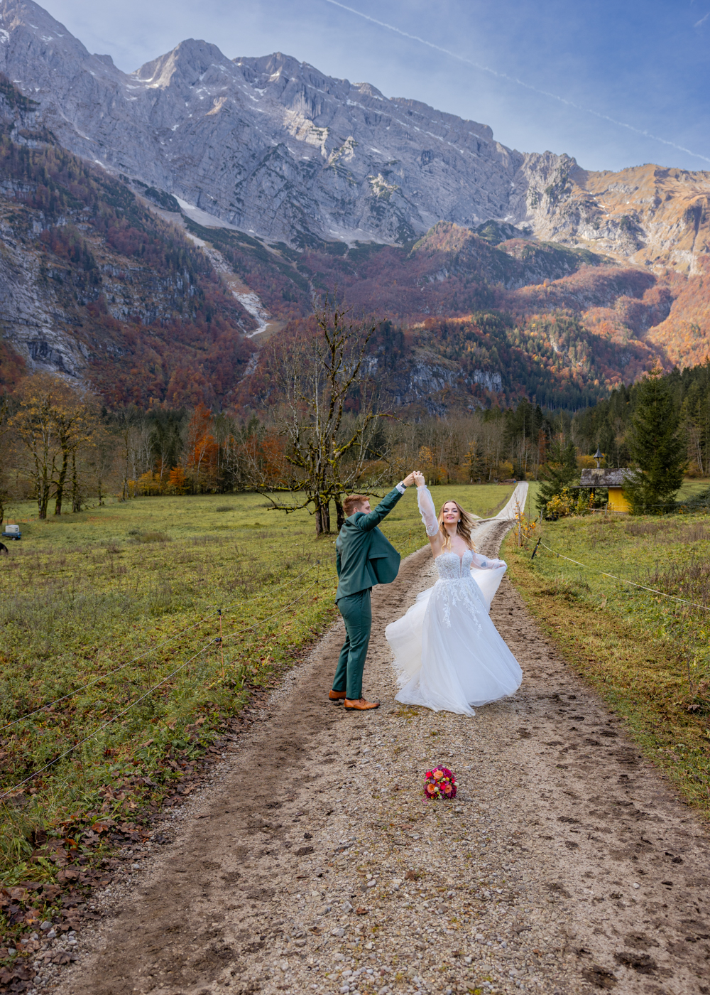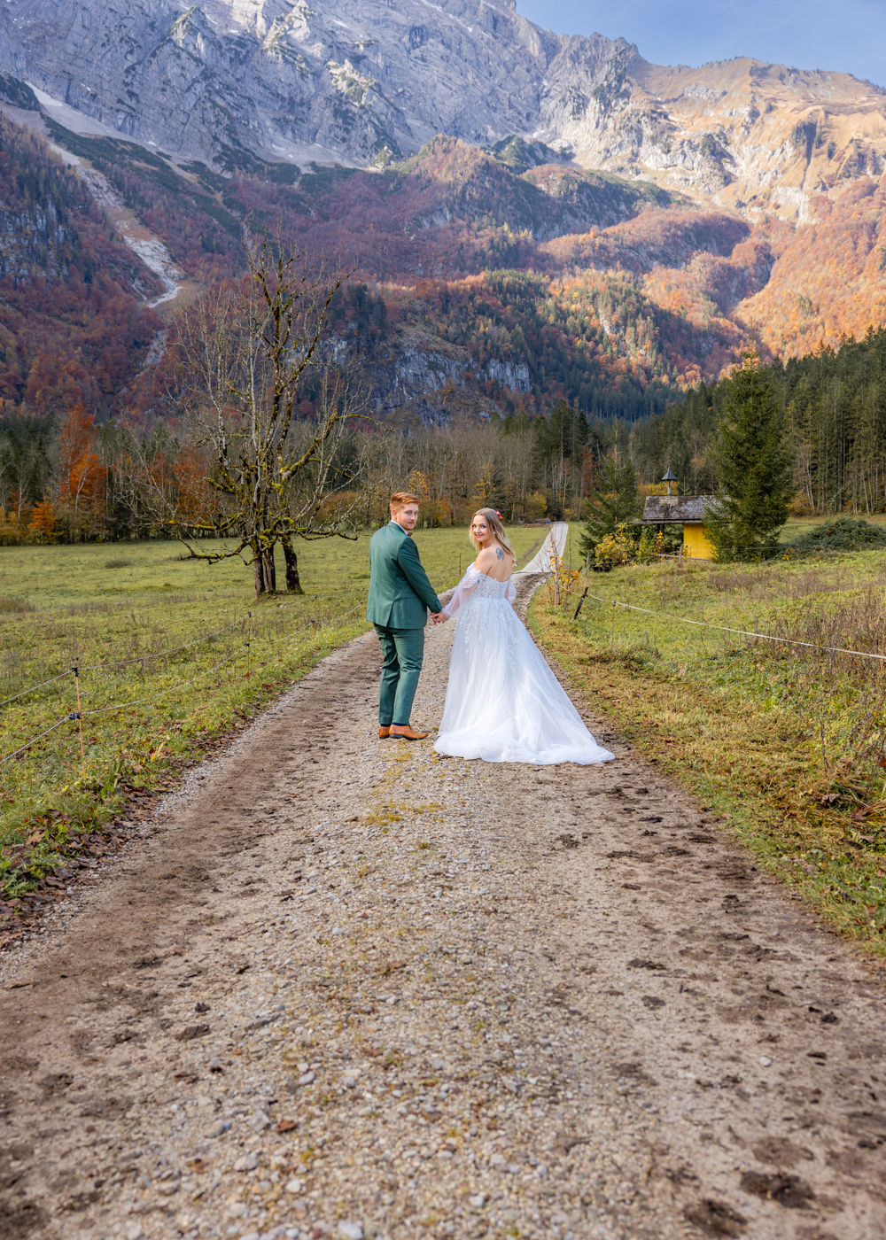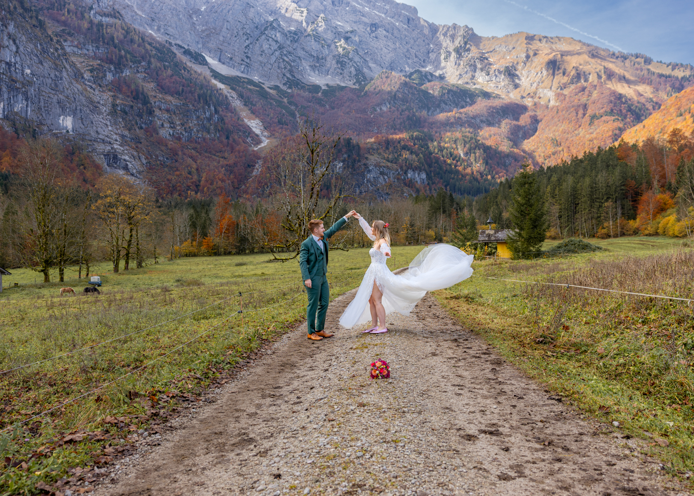 Der Kühschwalbweg liegt versteckt im Salzburger Land, direkt unterhalb des Hohen Göll. Ein Platz, der schon von den Kelten verehrt wurde – ruhig, mystisch und weit weg vom Trubel klassischer Hochzeitslocations. Perfekt für Paare, die Natürlichkeit, echte Momente und pure Emotionen suchen.